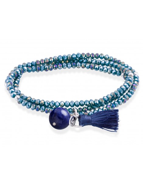 Pulsera de plata de primera ley (925) con baño de rodio con cristal de Strass facetado color azul london y lapislazuli. (largo: 51 cm.)