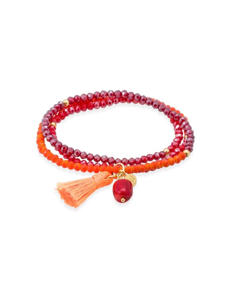 Pulsera de plata de primera ley (925) chapada en oro amarillo de 18kt, con nucleo de silicona elástica y cristal de strass facetado, con coral bamboo. Talla media de 17 cm. (51 cm. total)