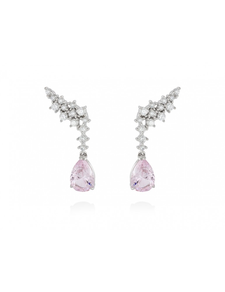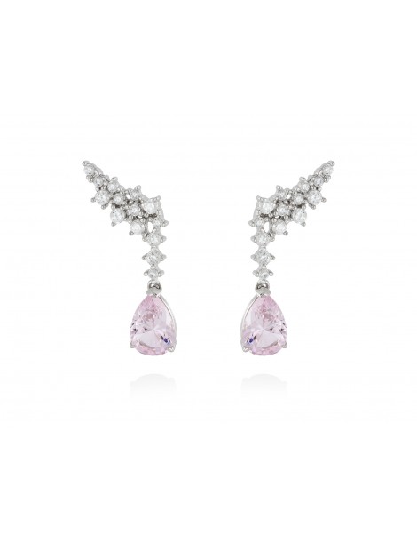 Pendientes de plata de primera ley con baño de rodio , zirconita blanca y piedra rosa agua sintética. ( tamaño 3 cm )