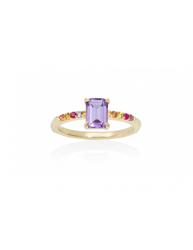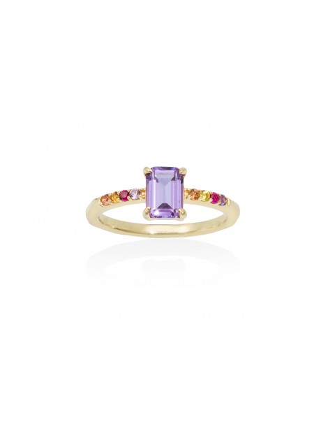 Anillo plata de primera ley chapada en oro amarillo de 18kt con circonitas multicolor y piedra sintética color amatista
