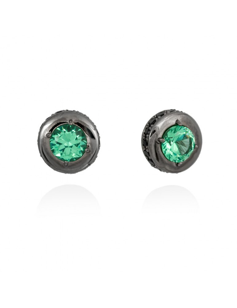 Pendientes de plata de primera ley (925) con baño de rutenio con espinela negra sintética y piedra sintética color esmeralda. (tamaño: 1 cm.)