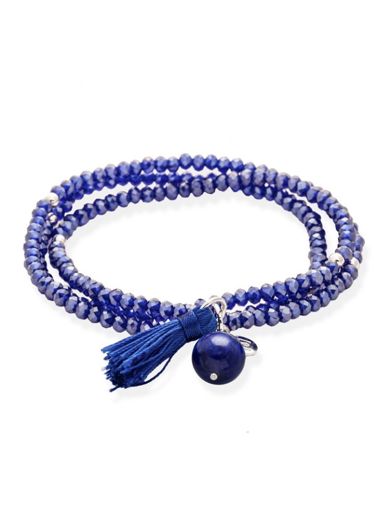 Pulsera de plata de primera ley (925) con baño de rodio con cristal de Strass facetado azul y lapislazuli. (medida de muñeca: 51 cm.)