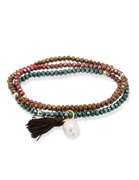 Pulsera de plata de primera ley (925) chapada en oro amarillo de 18kt y cristal de Strass facetado multicolor con perla cultivada. (largo: 51 cm.)